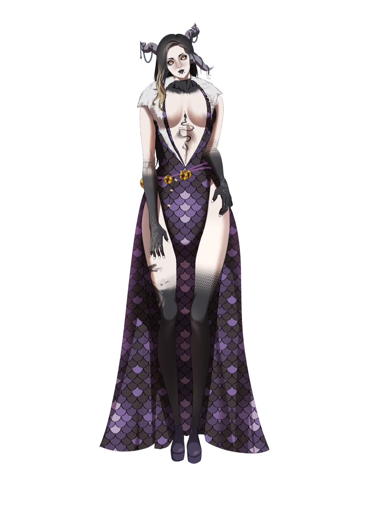(MODEL: Deville Ravenholm-Schwarzfeuer XII)Starting us off for the Abyssal Gala is a dark ensemble inspired by Echidna - the noble charged with protecting the Void Queen Scathach.The Royal Void-Guard’s Galerus comes with equal parts form and function, while also providing a pleasing view from any angle. From the scaled tights and jeweled skirt, to the headdress and feathered shoulderguards which were modeled after Echidna’s two servants, this ensemble is ideal for those who enjoy being light on their feet without sacrificing mobility.The scarf and tail are its biggest features - modeled after the Voidsent noblewoman’s color scheme. And as an extra feature: the tail is hollowed out, allowing those possessing actual tails to have a special protective layer while still granting free range of movement.Enjoy this new take on coliseum fashion; where it’s being a Bloodsands combatant or wanting to have a menacingly sexy aura, the Royal Void-Guard’s Galerus is right up your couturial alley!