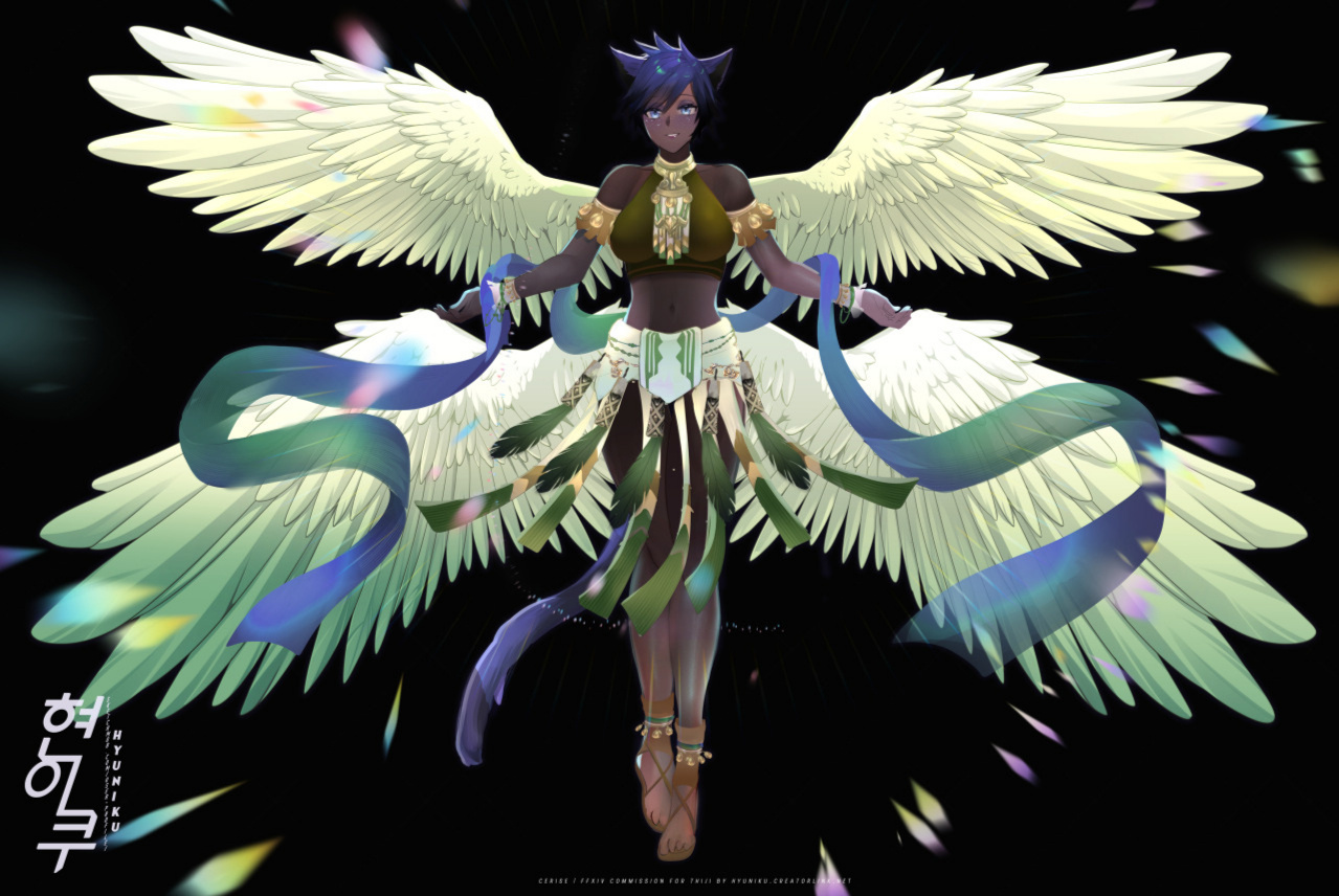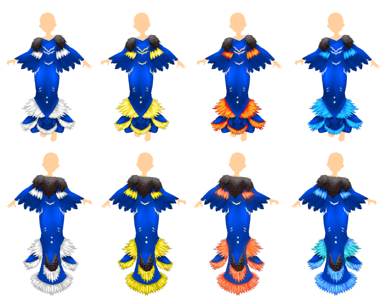 Ever continuing efforts in bettering relations with the allied societies, the Higuri Regalia made first contact with the native Hanuhanu of Kozama’uka, and rumors spread quickly of their upcoming line that the avian peoples were all too eager to contribute!The huipil is but one of many types of clothing worn by the indigenous Turali; what makes this particular one special is that it is woven primarily with the very reeds that the Hanuhanu use in their day-to-day activities, which naturally gives it unparalleled breathability due to its heavy wind-aspected signature.While the bright colors and decorative embroideries are pleasant in their own right, the crowning feature of this outfit is that it bears the likeness of Kixaihih - the deity revered by the Hanuhanu, and the very being which blesses them with the power of the wind. The leggings come with feet resembling moccasins, and can be comfortably worn with additional footwear for those looking to traverse rough terrain, and the feathered headdress of the Hanu deity brings it all together, displaying a proud sight from any angle.The cleverly-named Kixai’huipil is an excellent compliment to any wardrobe looking for some New World flair, whether you’re out for a breezy stroll through the mire, or seeing the sights with the Turali Travel Agency!