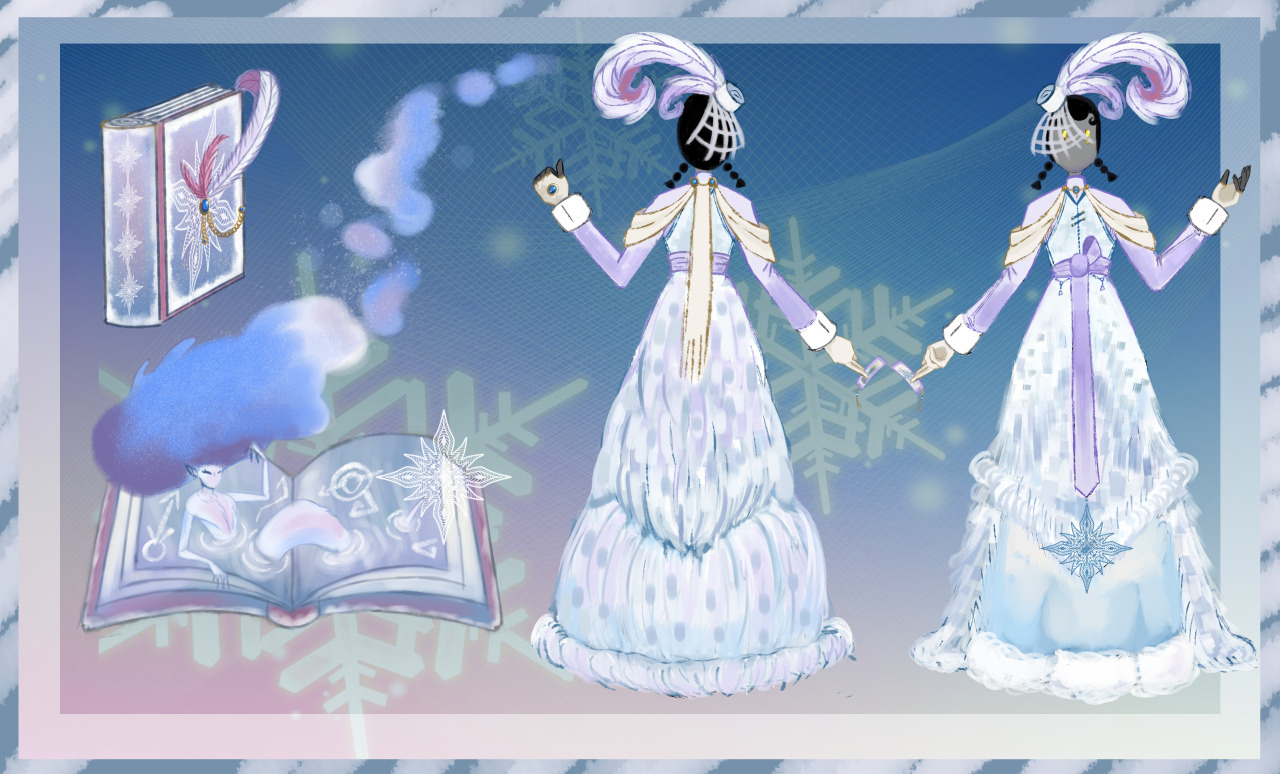 The codex which serves as the Scholar’s arm is unique in its own right - the Verba Hiemalia - or “Words of Winter” - houses within it a special faerie that lives within its pages. This dashing little helper is called “Chione”, and is a rather plucky character. The faerie only dwells within the codices of which it approves, and once done so, will lend the Scholar its power. When Seraph is called, Chione will leap from the pages to take her place, putting its full strength to use on the battlefield with ice barriers and restorative snow showers. It may even launch a beam of frost at your foes to silence any pesky incantations!As a further addition to the continued prowess exemplified by Scholars, the recent apex of their abilities allows them to temporarily assume an angelic form through a technique known as Seraphism. Tapping into the very essence of their faerie, the user’s aether fuses with that of their tiny companions to transform into a majestic being that enhances their barrier magicks.With the Himvat Strategist’s Gown, it, too, comes with its own unique form, providing an icy twist to the angelic visage. Furthermore, the wearer’s aether is infused with frost, providing a dazzling display of flourishing snow whenever Manifestation or Accession is cast, and during Emergency Tactics, a miniature gust of chilling wind gathers around the Scholar which will be unleashed into a wintry burst of restorative aether.Per the Diamond Sultan’s favorite statement, the mind shall vanquish the sword. This continues to ring true as the Himvat Strategist’s Gown becomes the wintry artifact gear for the graceful tactician. The codex even comes with its own bookmark!